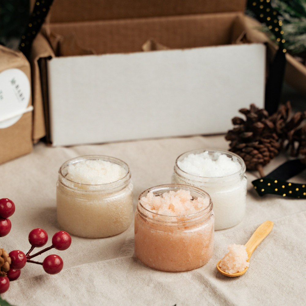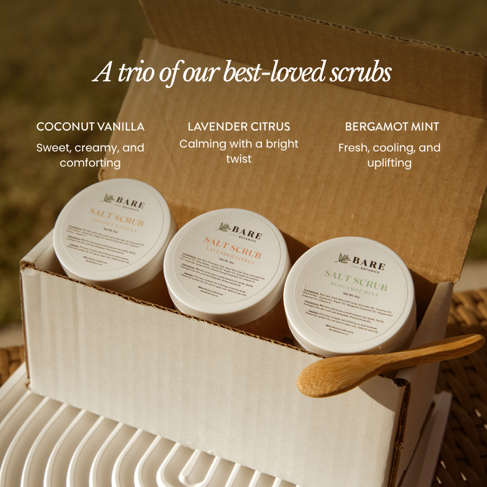 Give the gift of glow. This curated set features three of our best-loved scrubs: Coconut Vanilla, Lavender Citrus, and Bergamot Mint. Each one is handcrafted to smooth, soften, and restore radiance. Made with pure sea salt and deeply moisturizing plant-based oils, every jar provides gentle exfoliation that leaves skin fresh, hydrated, and naturally luminous. Perfect for birthdays, holidays, or moments of self-care, this set is a thoughtful way to share a simple ritual for glowing skin.