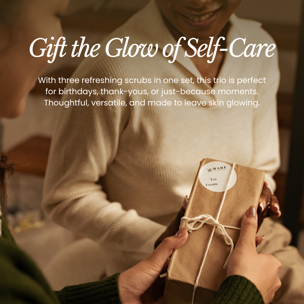 Regular price $24.95Give the gift of glow. This curated set features three of our best-loved scrubs: Coconut Vanilla, Lavender Citrus, and Bergamot Mint. Each one is handcrafted to smooth, soften, and restore radiance. Made with pure sea salt and deeply moisturizing plant-based oils, every jar provides gentle exfoliation that leaves skin fresh, hydrated, and naturally luminous. Perfect for birthdays, holidays, or moments of self-care, this set is a thoughtful way to share a simple ritual for glowing skin.