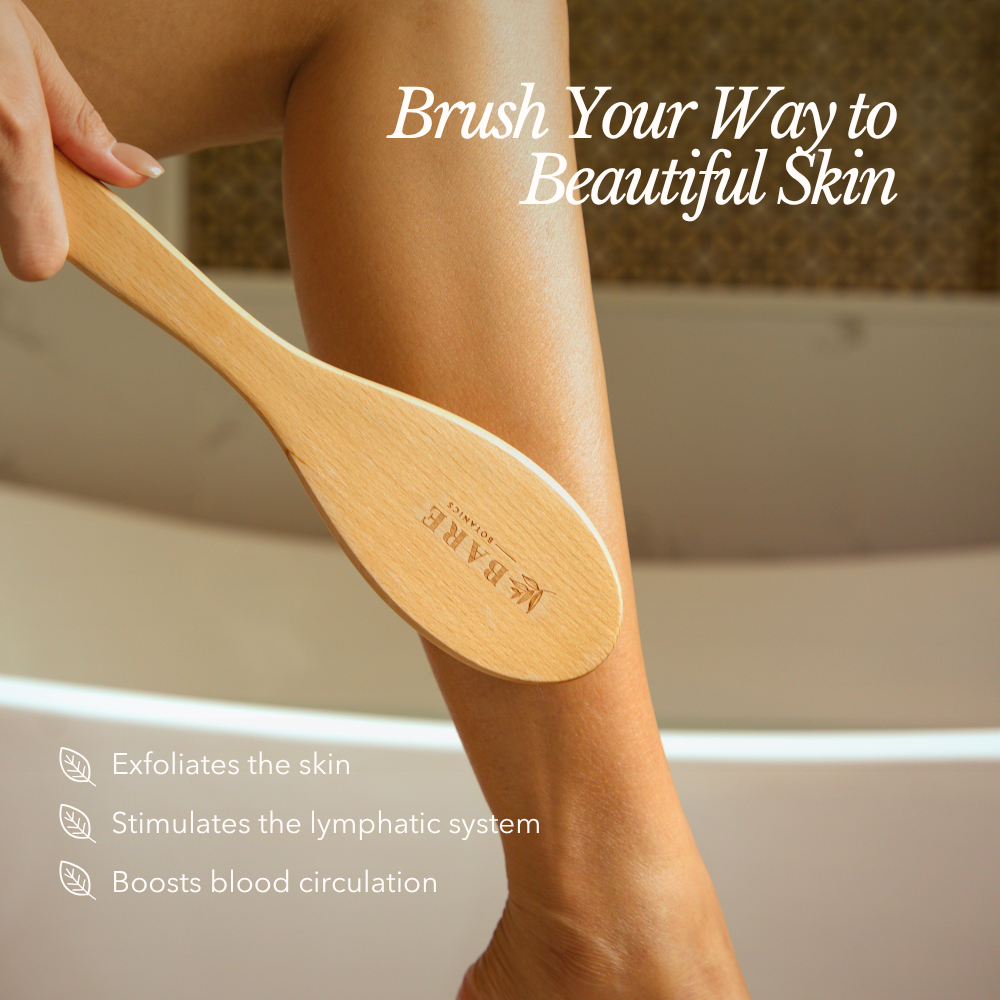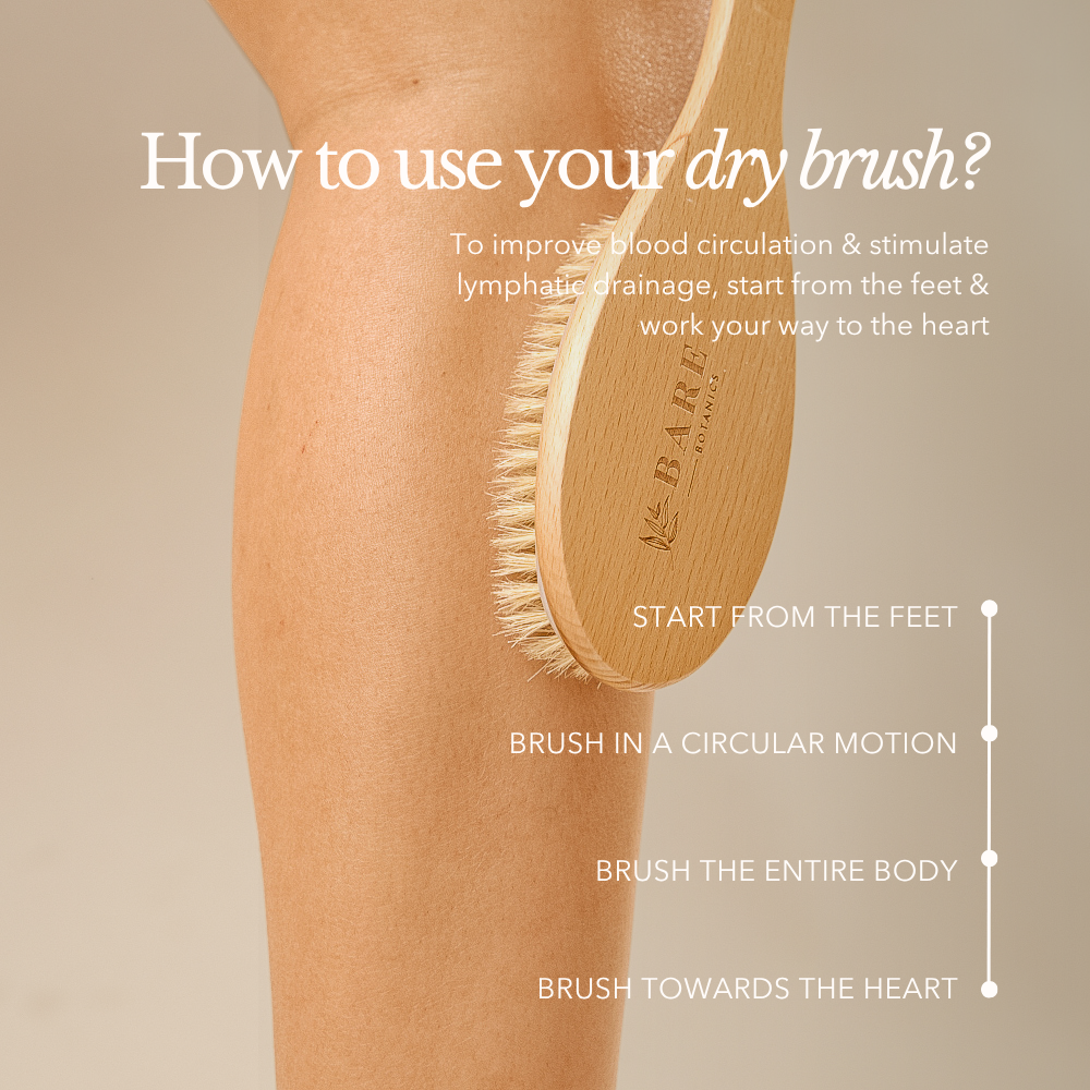 Use dry before showering or wet with gentle soap for added exfoliation. Start from your extremities and brush in circular motions toward your heart. This helps promote circulation and supports lymphatic drainage.