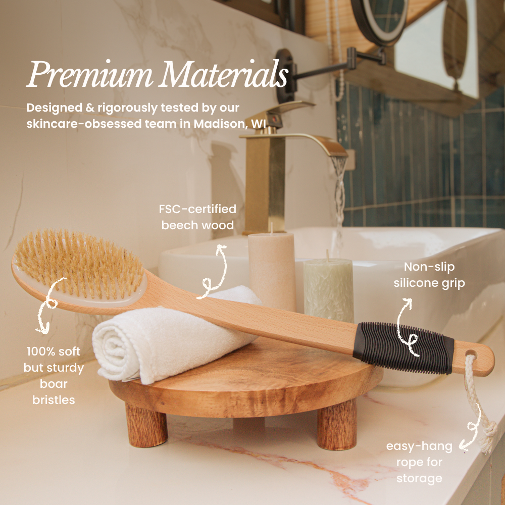 Reach, refresh, and renew with our long-handle dry brush, designed for full-body exfoliation and easy self-care. Crafted with natural boar bristles that are soft yet firm, it gently buffs away dull, dry skin to reveal a smoother, healthier-looking glow.