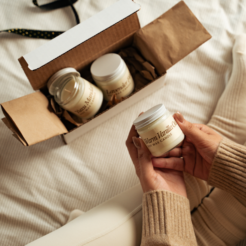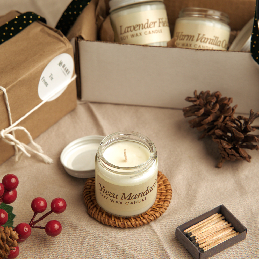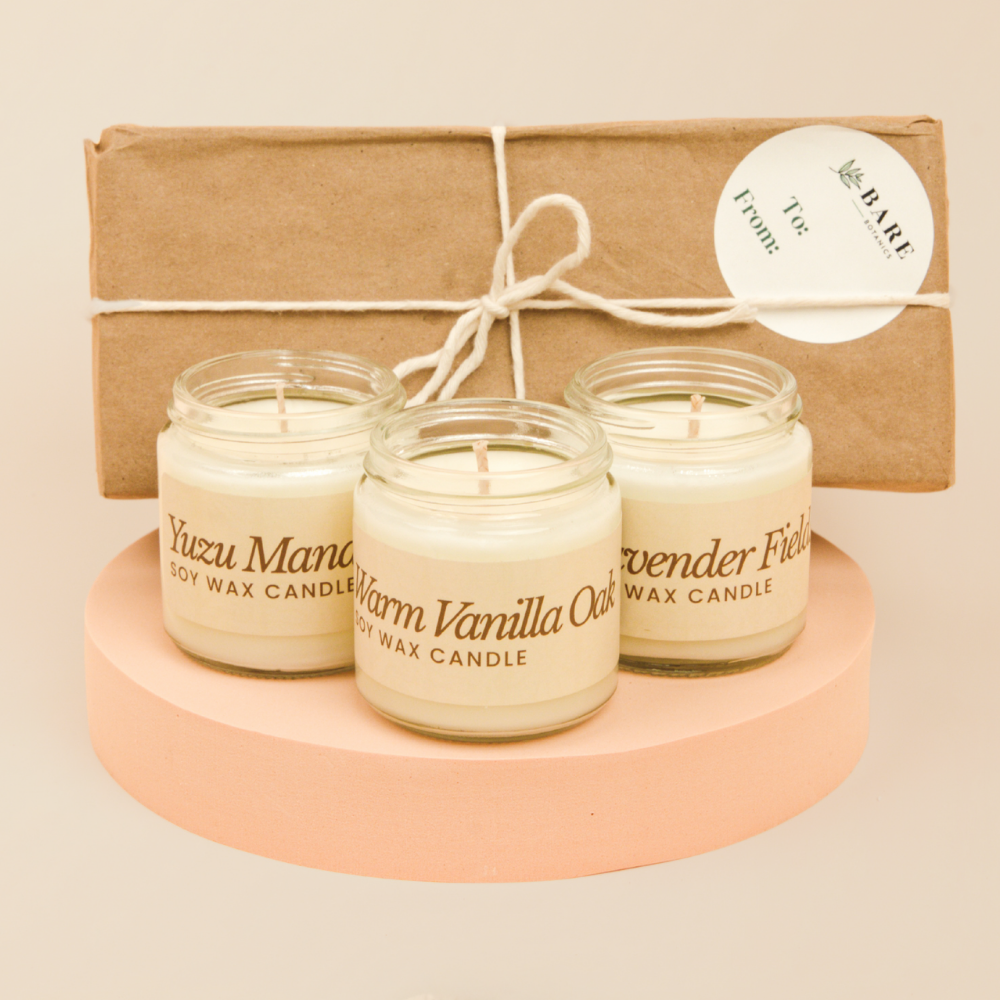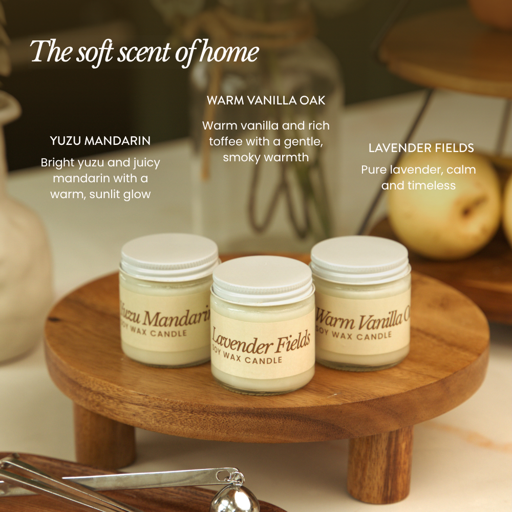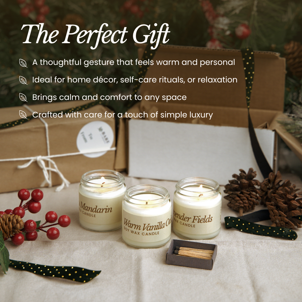 Bring warmth and fill your space with the soft scent of home through our Candle Gift Set. Each candle is hand-poured with pure soy wax, a clean cotton wick, and plant-based fragrance oils for a smooth, even burn and a naturally comforting glow.