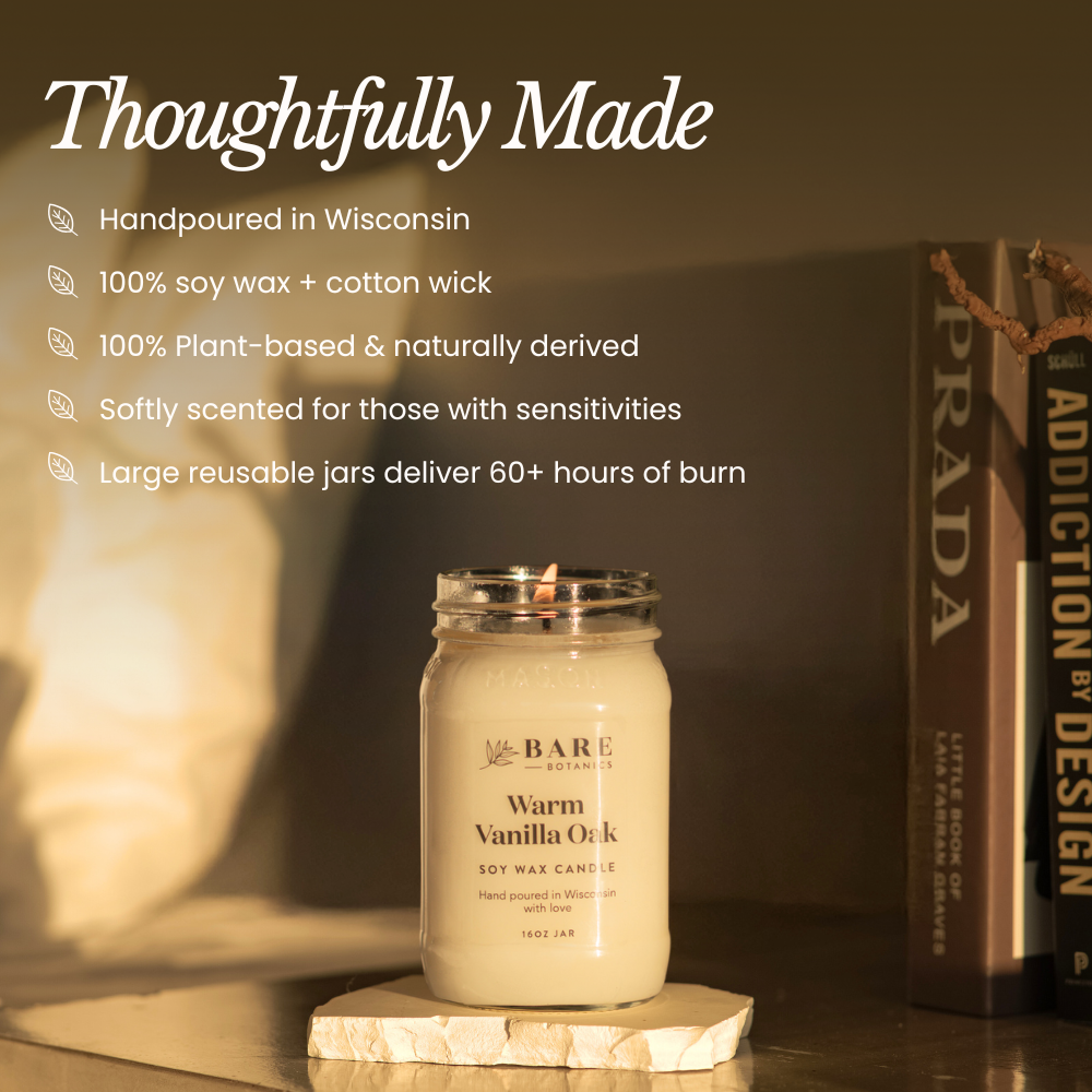 Made purely with soy wax, plant-based fragrance oils, and cotton wick