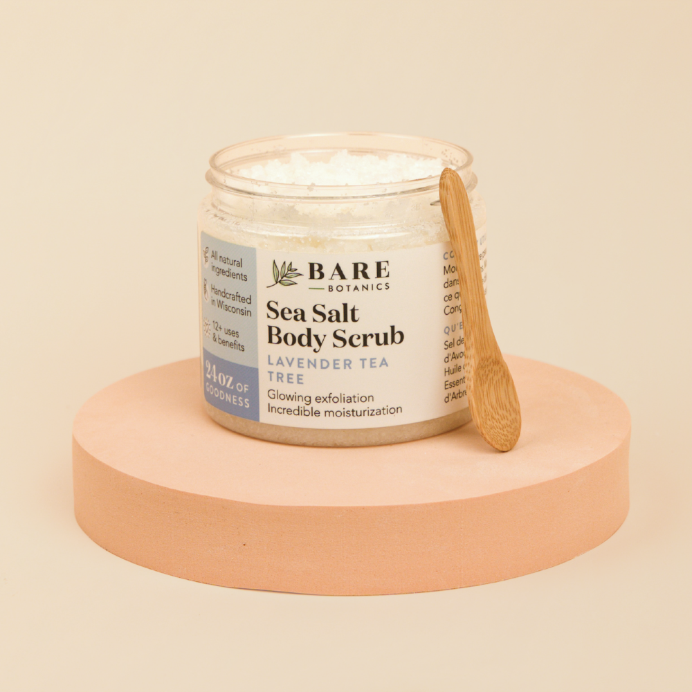 Our signature blend of Sea Salt, Aloe Vera Juice, Coconut Oil, Avocado Oil, Shea Butter, Glycerin, Arrowroot Powder, Jojoba Oil, Argan Oil, Lavender Essential Oil, Tea Tree Essential Oil, and Vitamin E. That's it!