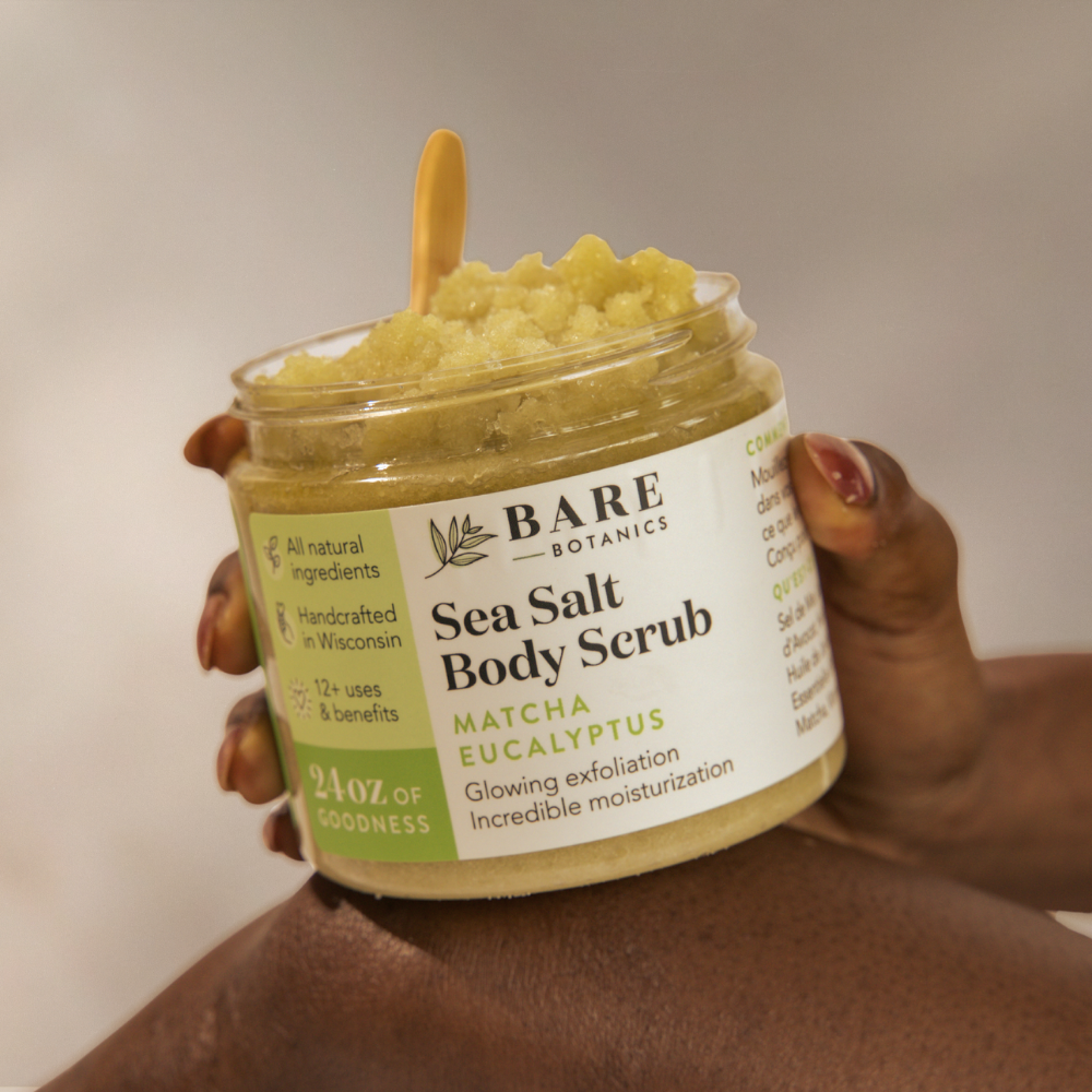 Our signature blend of Sea Salt, Aloe Vera Juice, Coconut Oil, Avocado Oil, Shea Butter, Glycerin, Arrowroot Powder, Jojoba Oil, Argan Oil, Eucalyptus Essential Oil, Green Tea Matcha Powder, Vitamin E. That's it!